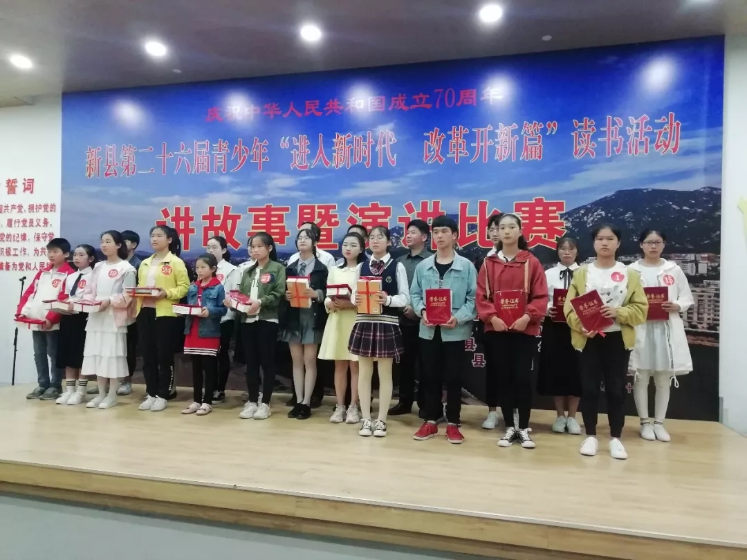 砥礪讀書奏華章,奮進(jìn)紅城溢書香。為慶祝中國人民共和國成立70周年,深入培育和踐行社會(huì)主義核心價(jià)值觀,激發(fā)新縣青少年緊跟新時(shí)代、愛黨愛國家的熱情,全面展示縣青少年愛國主義讀書教育活動(dòng)取得的豐碩成果,5月30日,以“進(jìn)入新時(shí)代 改革開新篇”為主題的新縣第26屆青少年愛國主義教育讀書活動(dòng)講故事暨演講比賽在縣圖書館隆重舉行。