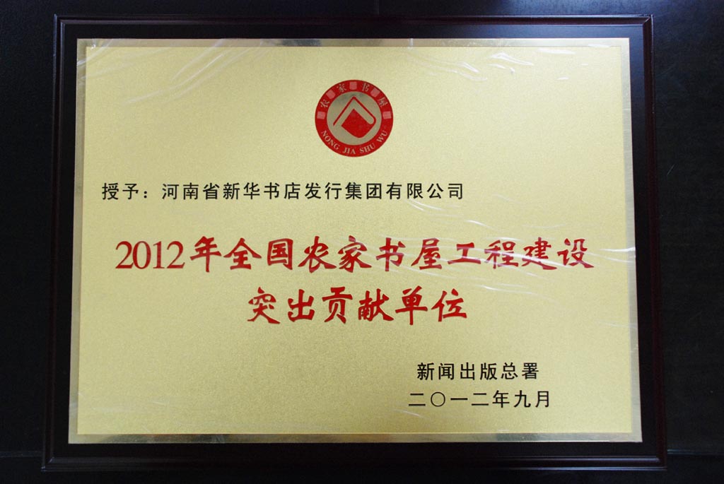 在9月底召開的全國農(nóng)家書屋工程建設(shè)總結(jié)大會(huì)上,河南省新華書店發(fā)行集團(tuán)有限公司被國家新聞出版總署授予“2012 年全國農(nóng)家書屋工程建設(shè)突出貢獻(xiàn)單位”稱號(hào),以表彰河南省新華書店發(fā)行集團(tuán)有限公司多年來熱心公益、服務(wù)大局,深入基層、服務(wù)農(nóng)民,為農(nóng)村文化建設(shè)工作中做出的卓越貢獻(xiàn)。