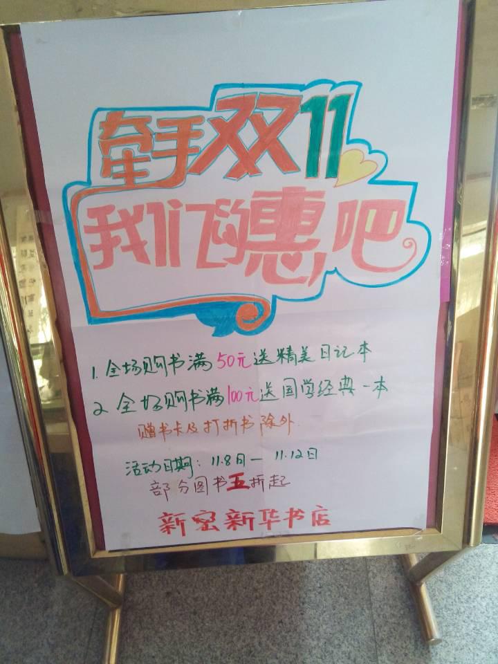 近幾年來,雙十一網絡銷售數(shù)字驚人,為搶占圖書銷售市場,分得網絡銷售一杯羹,新密市店開展“牽手雙十一,我們約惠吧”主題活動。本次活動通過提前張貼宣傳海報、擺放圖書造型營造節(jié)日氣氛,同時采取購書贈禮、打折讓利等多項優(yōu)惠活動吸引讀者。