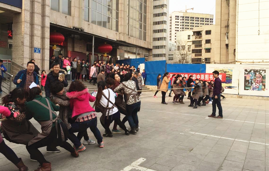為慶祝“三·八”婦女節(jié),豐富職工的精神文化生活,增強凝聚力和團(tuán)體合作精神,中原圖書大廈于2015年3月8日下午,舉辦了女員工拔河比賽。